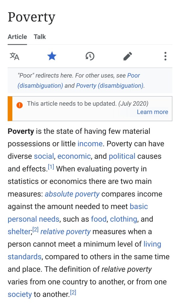 - Poverty refers to the state of having little or no money, material possessions, or access to resources. People living in poverty may have difficulty meeting their basic needs, such as food, shelter, and healthcare.