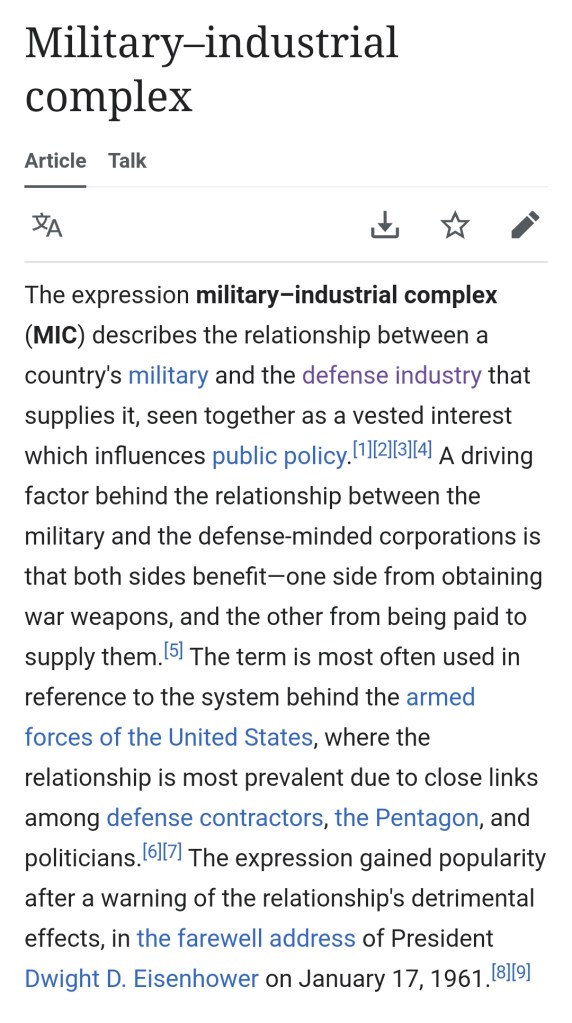 - https://en.m.wikipedia.org/wiki/Military%E2%80%93industrial_complex
