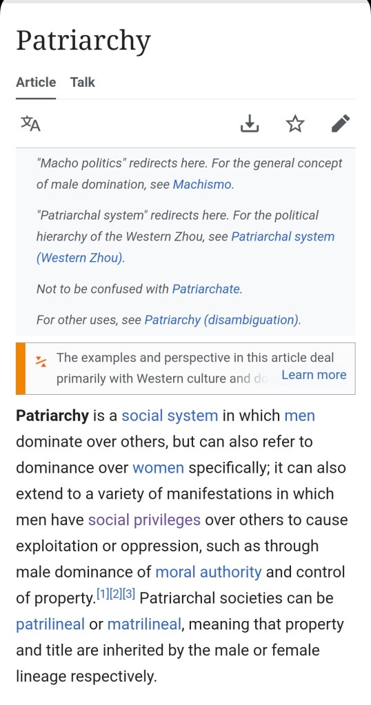 Patriarchy is a social system in which men hold the primary power and predominate in roles of political leadership, moral authority, and social privilege. A patriarchal system is typically centered around the family, with the father as the head of the household and the mother taking a subordinate role. (ao)