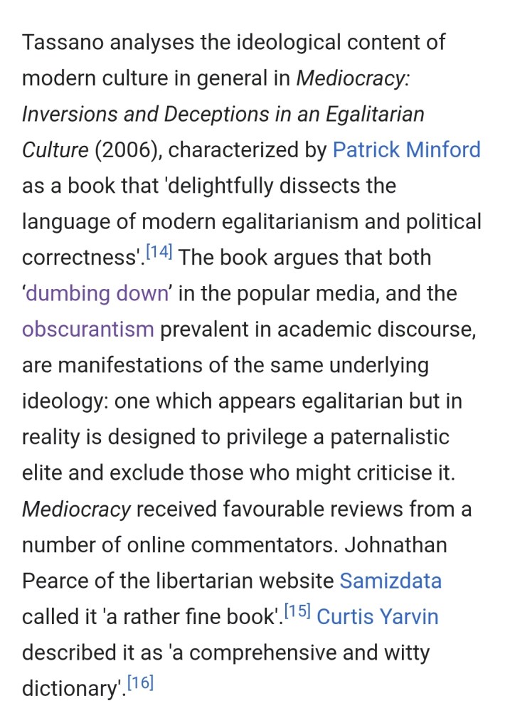 Mediocracy is a type of government or social system in which decisions are made based on the average or median opinion of the general population, rather than the opinion of a select few. It is a type of democracy in which citizens choose their leaders and representatives based not on their personal qualifications or experience, but on their ability to reflect the opinion of the majority. In other words, those in power are chosen based on their popularity or ability to garner the most votes, rather than on any particular set of skills or abilities. This form of democracy is often criticized for allowing the majority to make decisions that benefit themselves at the expense of the minority, and for allowing the most popular opinion to be the de facto law of the land. (oa)