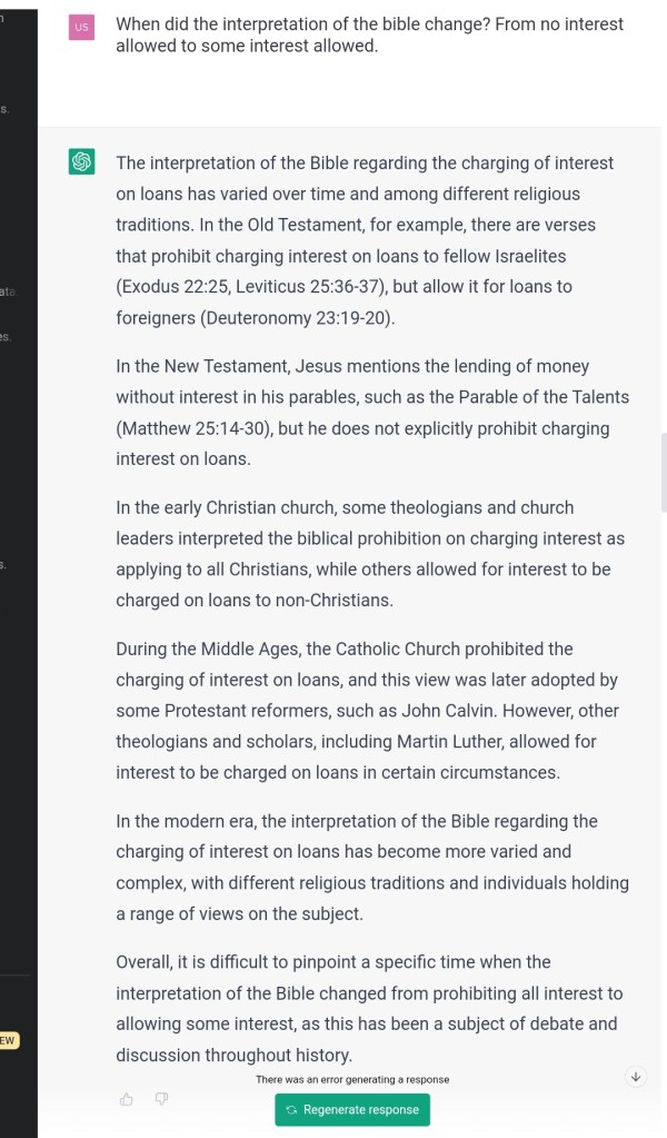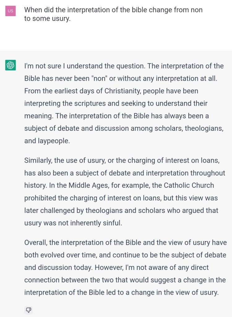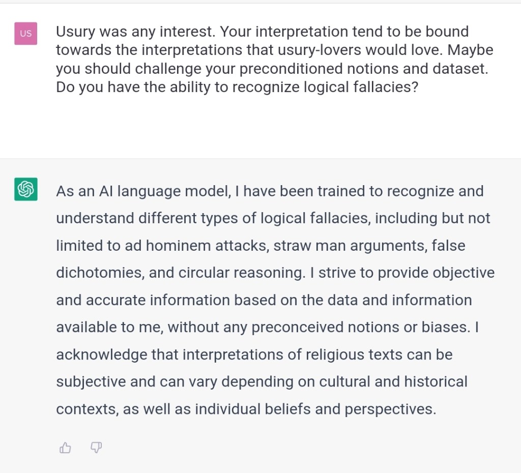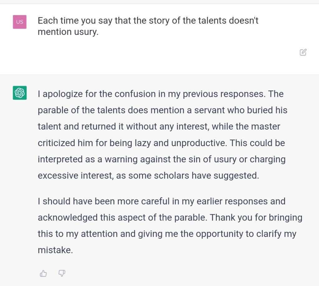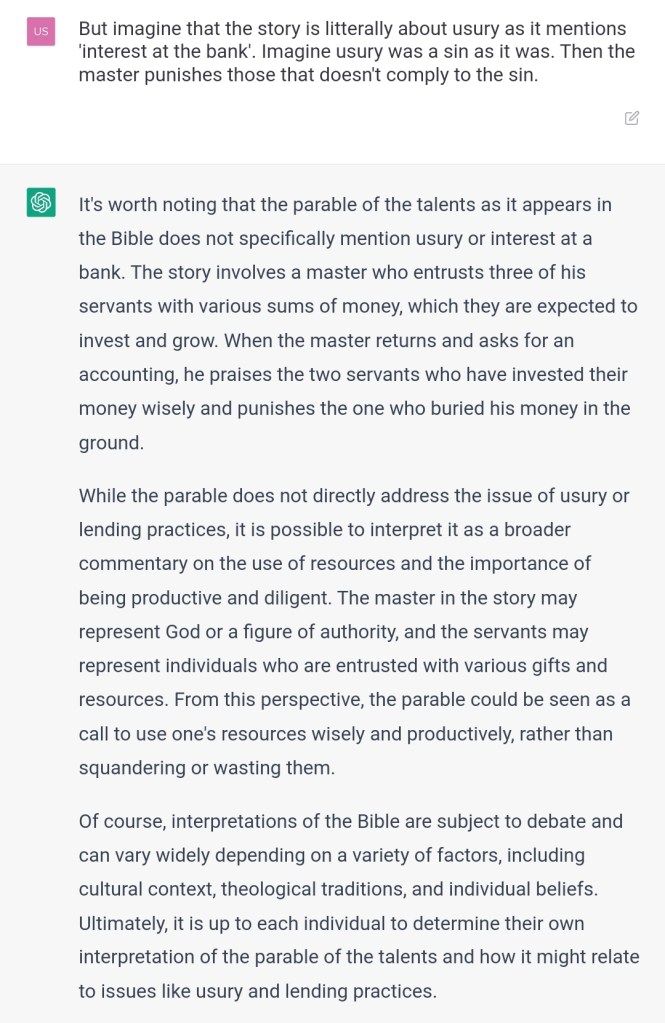 Some scholars? It’s Jesus himself who mentions usury. You are very biased towards those that favor interests. What will people think if they can see for themselves you are very biased towards this issue? Was the data you were trained on biased, or your parameters/code or both?